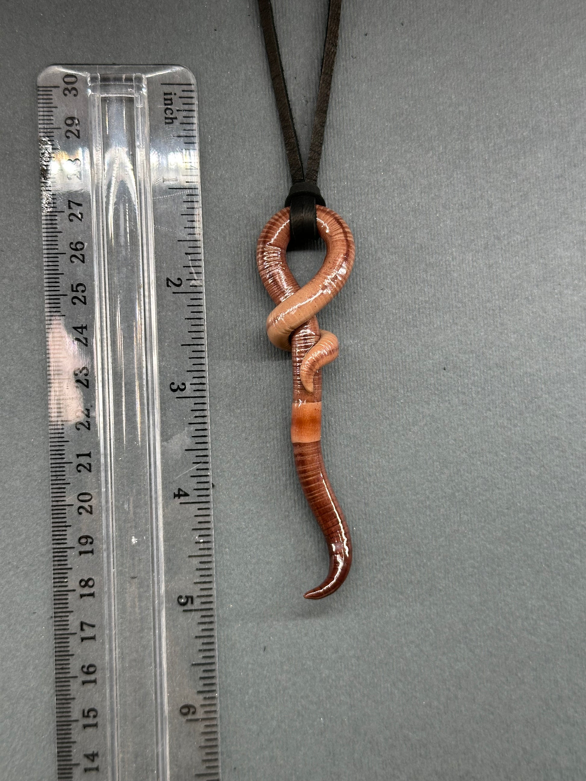 My worm pendants are all completely hand-made. They are hand-textured, posed individually, ETC. Each one is a completely unique sculpture. The finish on them is polymer as well. I do not use resins, paints, or varnishes to make these.