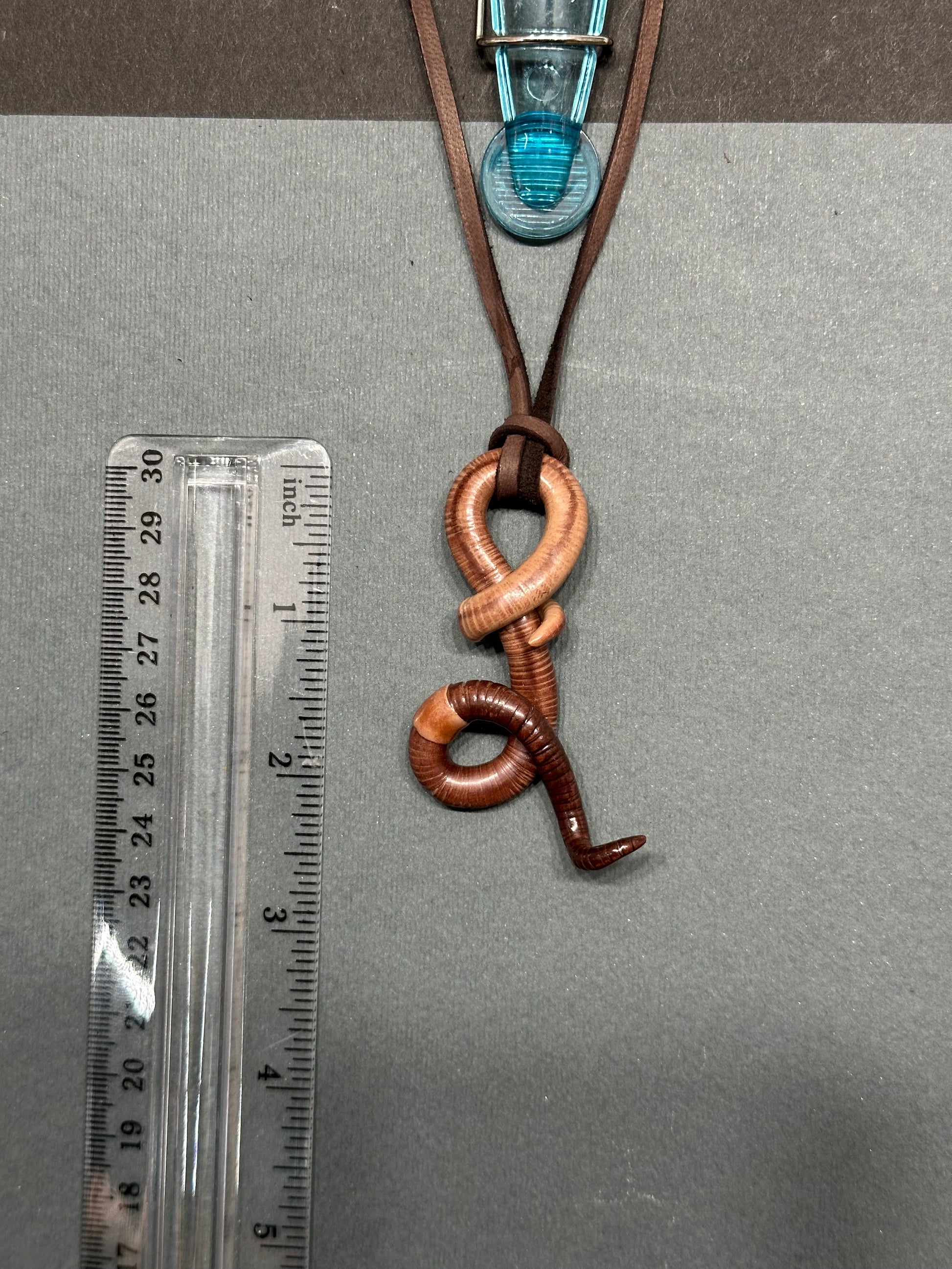 My worm pendants are all completely hand-made. They are hand-textured, posed individually, ETC. Each one is a completely unique sculpture. The finish on them is polymer as well. I do not use resins, paints, or varnishes to make these.